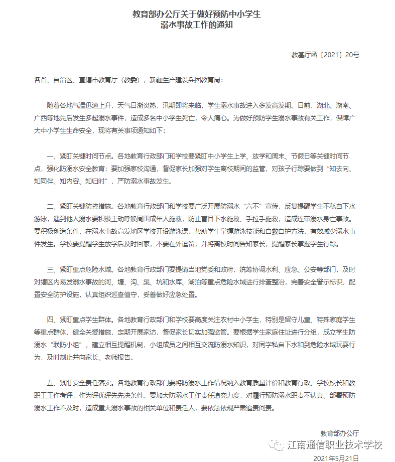 為做好預(yù)防學(xué)生溺水事故有關(guān)工作,保障廣大中小學(xué)生生命安全,日前,教育部印發(fā)《關(guān)于做好預(yù)防中小學(xué)生溺水事故工作的通知》,部署各地做好防溺水工作。